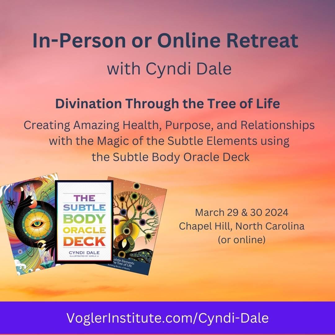 We’ll be exploring several cross-cultural Tree of Life ideas and metaphors before using the information in Cyndi’s brand new Subtle Body Oracle Deck to draw on our inner source of magic and intuition--and the Source--to apply the 12 major subtle elements for all concerns.